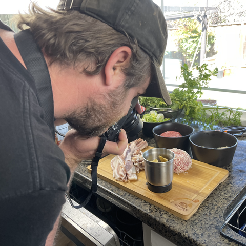 Bacon lattice: I laid out the bacon strips in a lattice pattern on the cutting board and wrapped each of the burgers in it. I transferred the bacon-wrapped burgers to a baking tray and baked them in the oven for 20 minutes. When the burgers reached 135°, I glazed them with the raspberry bacon jam and let them cook for another 3 minutes. I caught my husband gleaming with pride in me at this point (or maybe that was hunger?), and that boosted my spirits even more. ♥️