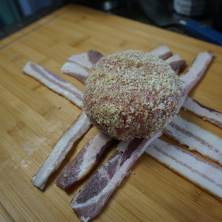 Bacon wrap: I went to the freezer to figure out a protein that I could wrap in bacon. My husband suggested that any type of ground meat would be easier to handle and I took his advice and chose ground beef as my protein. I decided to make a burger stuffed with Gouda cheese wrapped in bacon. I set aside the ground beef to thaw while I started prepping the bacon. I cut two pieces of bacon into small chunks while I slit the rest vertically to wrap around the burger. At this point, the burger meat was still thawing.